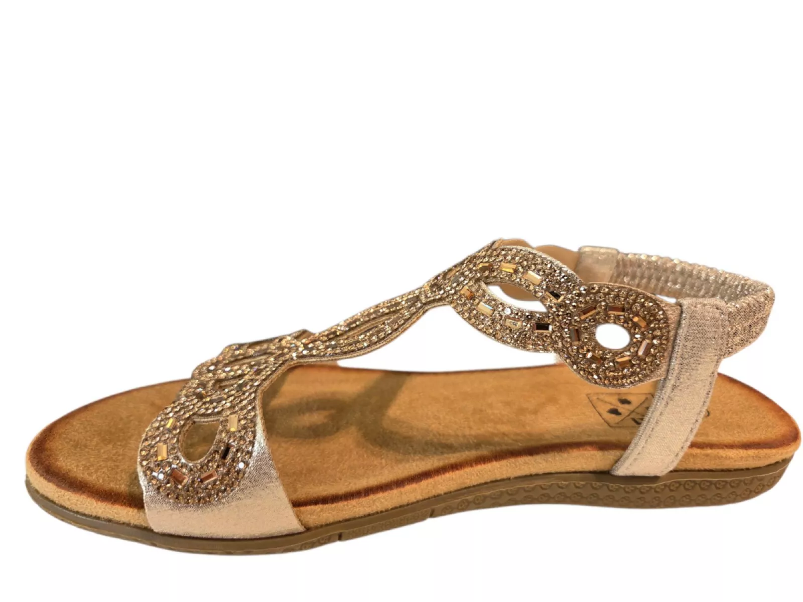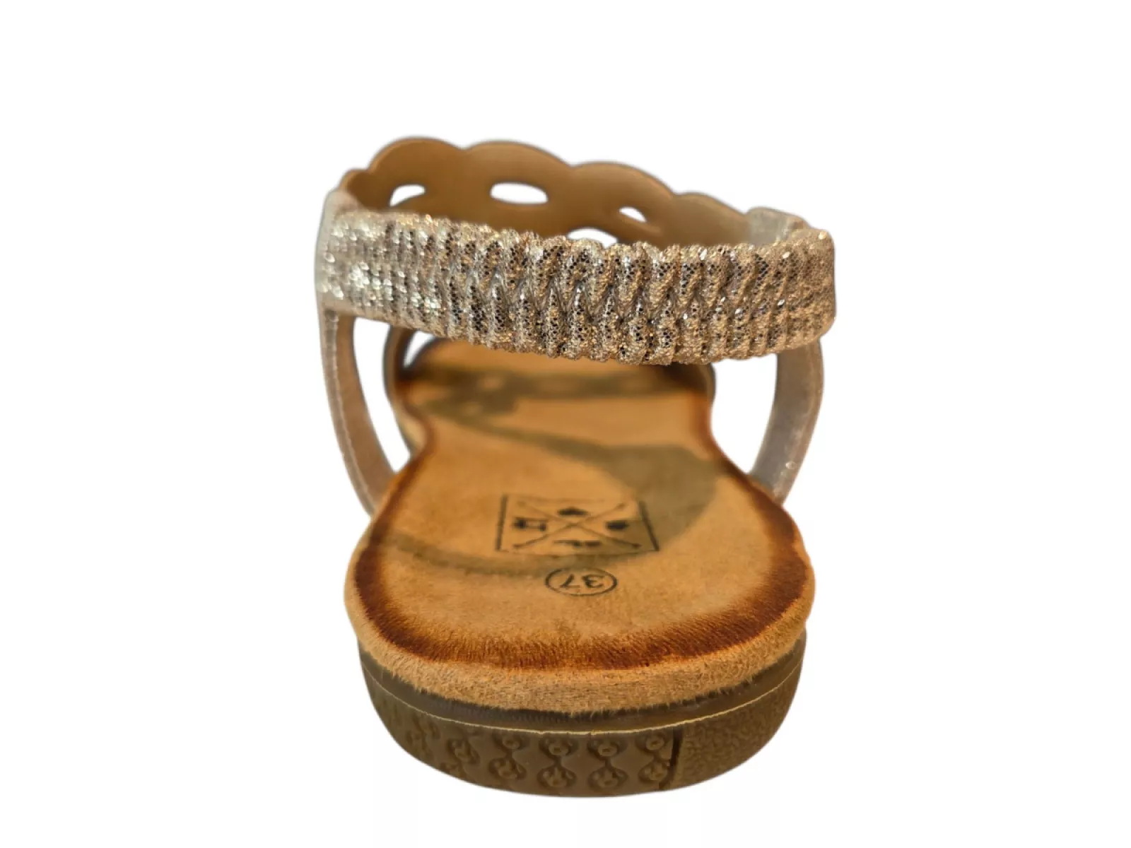 Stralend de zomer in met deze elegante goudkleurige sandalen van Bridge. De synthetische buitenkant en voering zorgen voor een luxe uitstraling, terwijl het vaste voetbed en de rubberen zool comfort en grip bieden. Dankzij de elastische sluiting stap je moeiteloos in en uit. Let op: deze sandalen vallen klein, bestel daarom een maat groter. Perfect voor het voorjaar en de zomer van 2026!