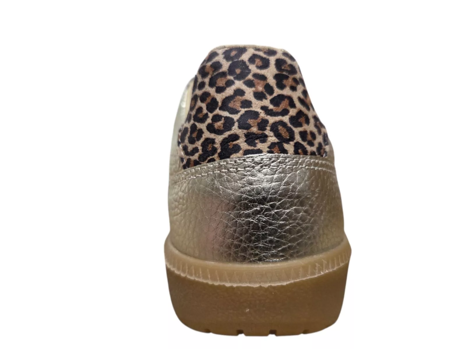Deze stijlvolle dames sneakers van Bridge combineren een opvallende goudkleur met een trendy luipaardprint. Het bovenwerk is uitgevoerd in hoogwaardig leer en zorgt voor een luxe uitstraling en een comfortabele pasvorm. Dankzij het uitneembare leren voetbed bieden de schoenen extra draagcomfort en zijn ze geschikt voor eigen inlegzolen.