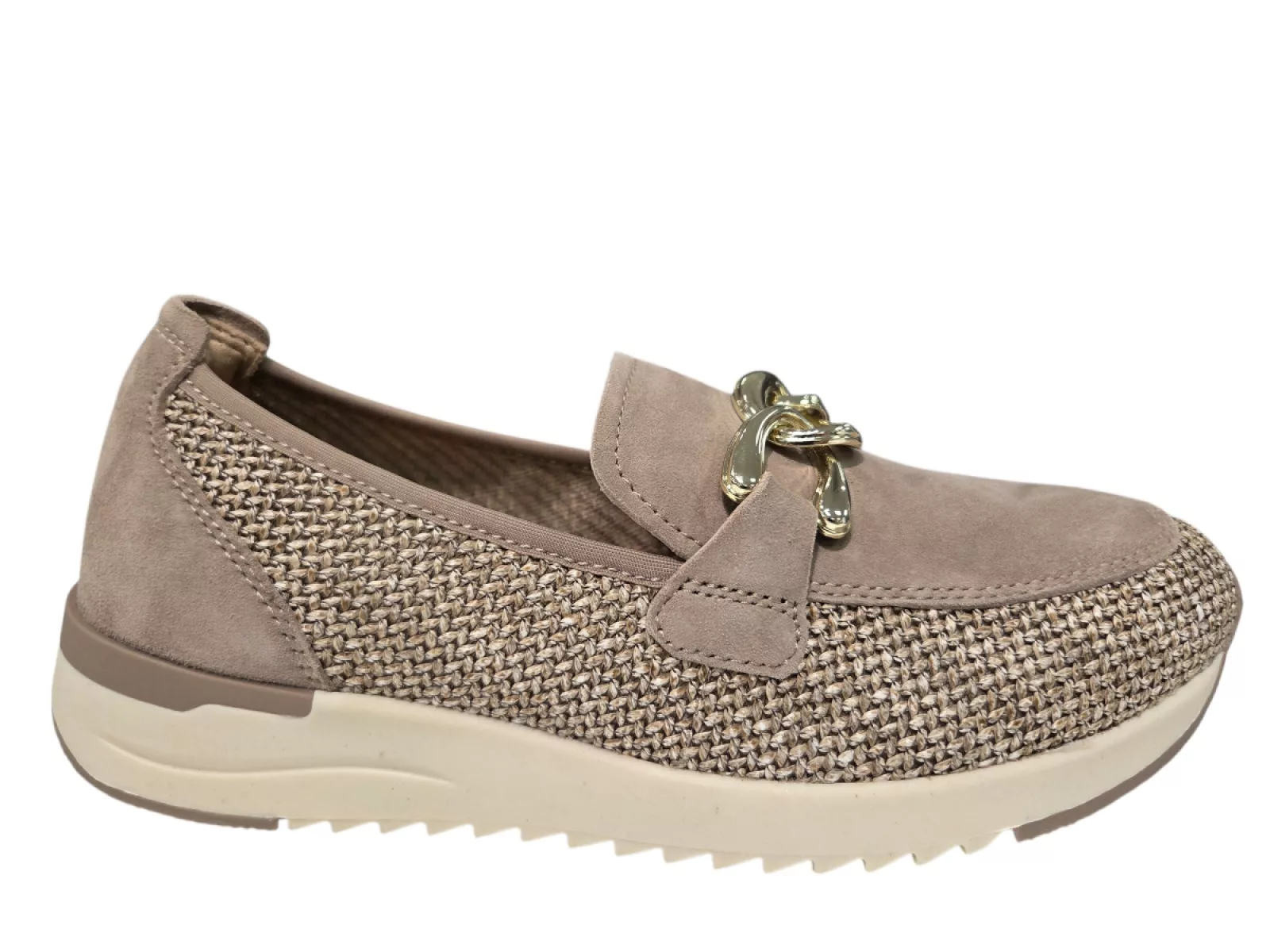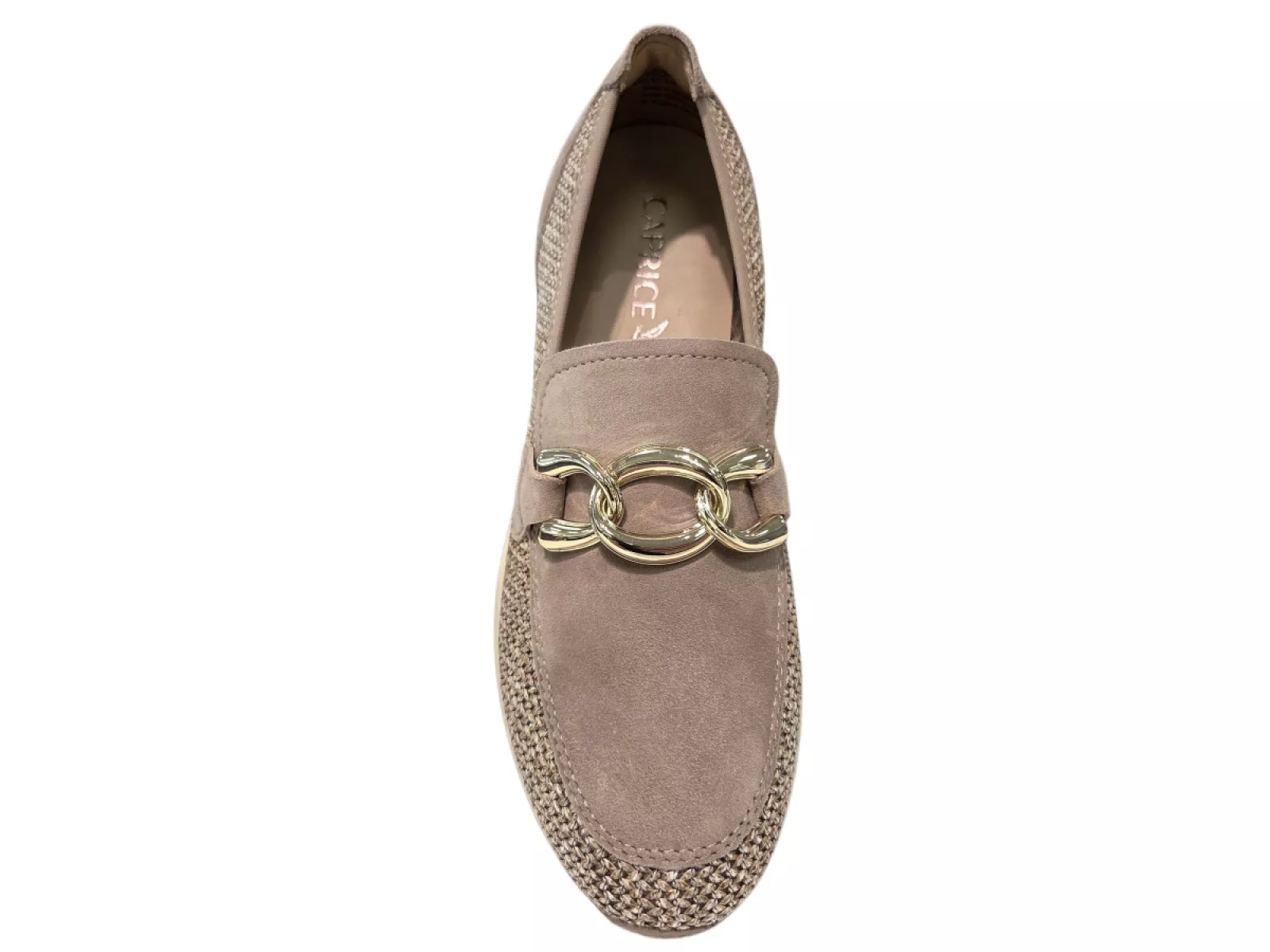 De Caprice 9-9-24505-46 326 dames instappers zijn stijlvolle en comfortabele zomerse instappers voor dames, perfect voor dagelijks gebruik. Deze elegante beige instapschoenen combineren hoogwaardig leer en suède met een luxe uitstraling dankzij het gouden riempje over de wreef. Ideaal voor wie comfort en mode wil samenbrengen.