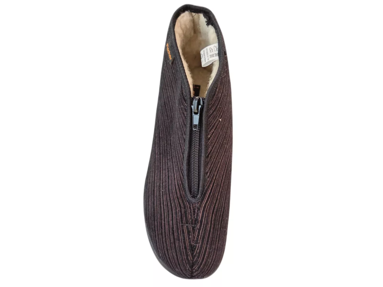 De praktische rits op de wreef maakt instappen eenvoudig, terwijl de stevige rubberen zool grip en stabiliteit biedt, ook binnenshuis. Dankzij de normale G-pasvorm sluit de pantoffel goed aan zonder te knellen.