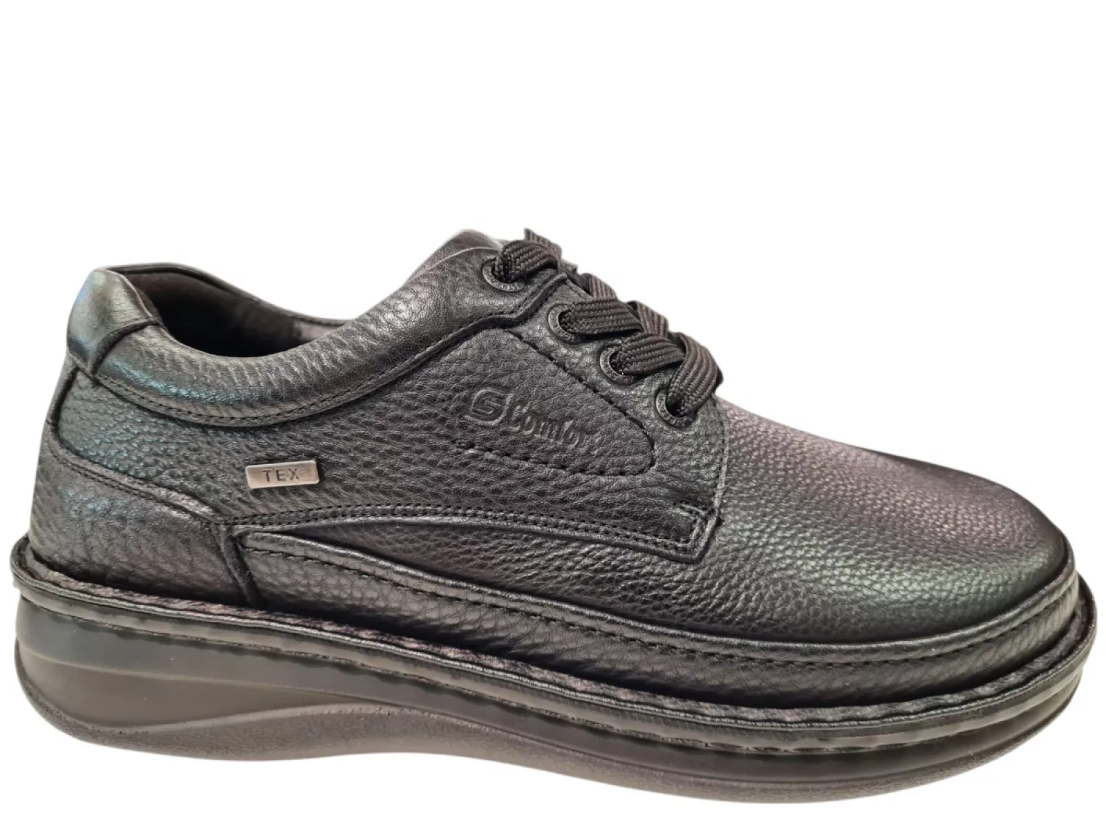 Beschikbaar in de kleur zwart, is de G Comfort Heren VeterSchoen veelzijdig en gemakkelijk te combineren met verschillende outfits. Of je nu een casual look of een meer geklede uitstraling wilt, deze schoen past bij elke gelegenheid.