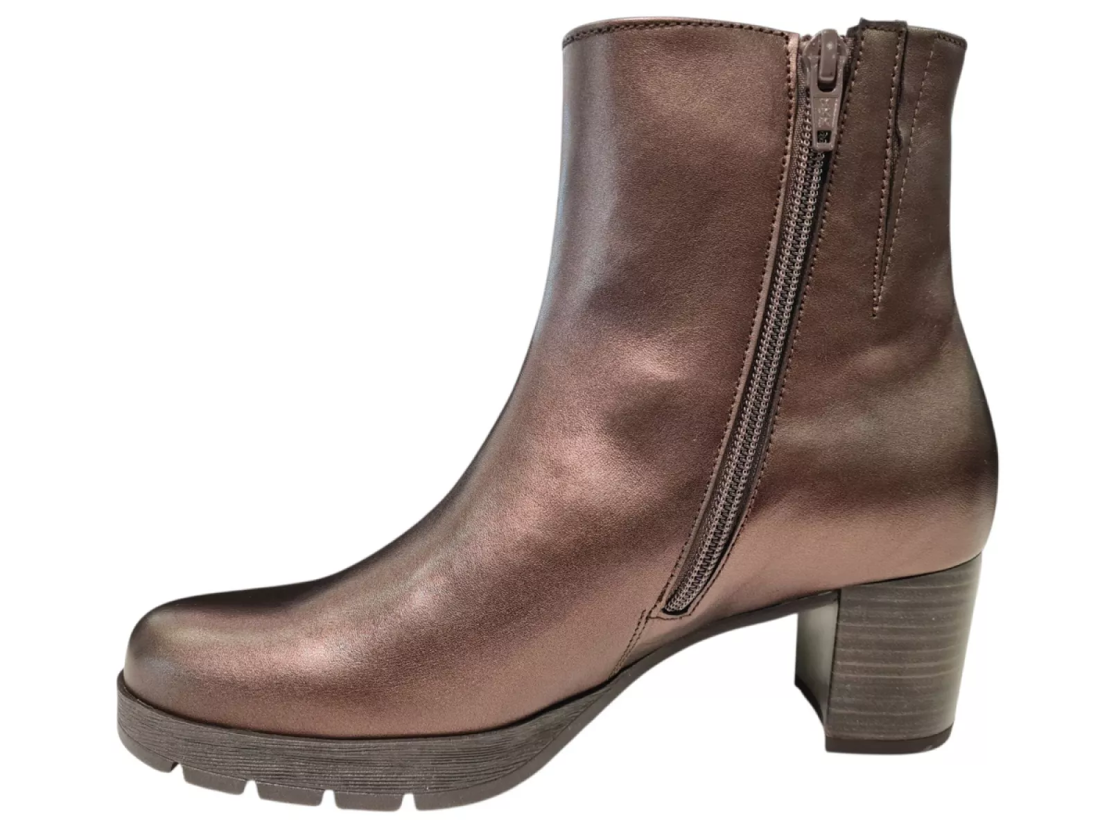 Ontdek de Gabor dames enkellaarzen in donker brons metallic. Deze stijlvolle laarzen zijn gemaakt van hoogwaardig leer, zowel van buiten als van binnen. Het uitneembare voetbed biedt extra comfort, terwijl de ritssluiting zorgt voor een gemakkelijke instap. De robuuste rubberen profielzool en de blokhak bieden stabiliteit en een trendy uitstraling. Perfect voor elke gelegenheid.