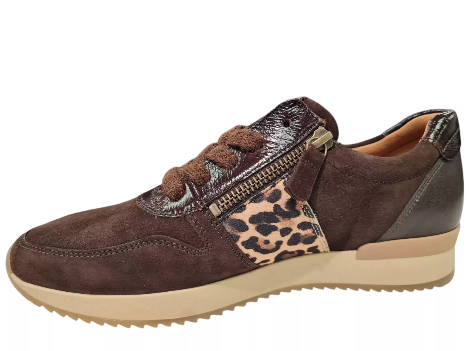 Stijlvolle sneakers van Gabor, uitgevoerd in leer en suede met een trendy panterprint. Deze schoenen zijn volledig leer gevoerd voor optimaal draagcomfort en beschikken over een uitneembaar voetbed. De rubberen profielzool zorgt voor goede grip. Dankzij de veter- en ritssluiting trek je ze eenvoudig aan en uit. Beschikbaar in een aantrekkelijke bruine kleur. Perfect voor een casual, modieuze look.