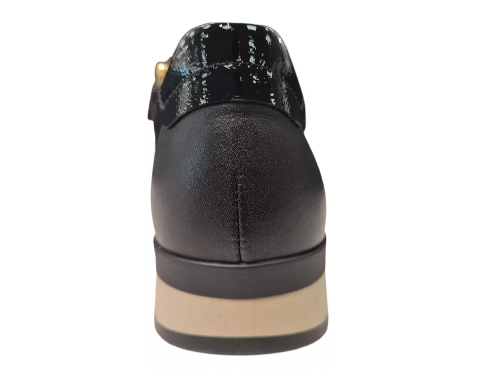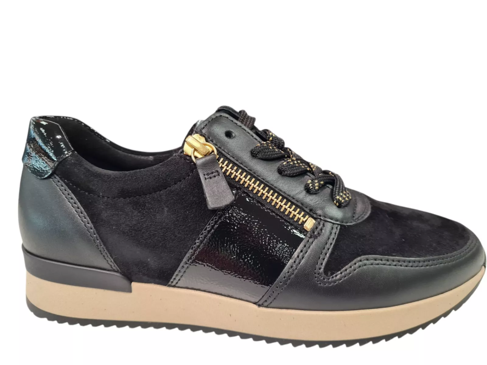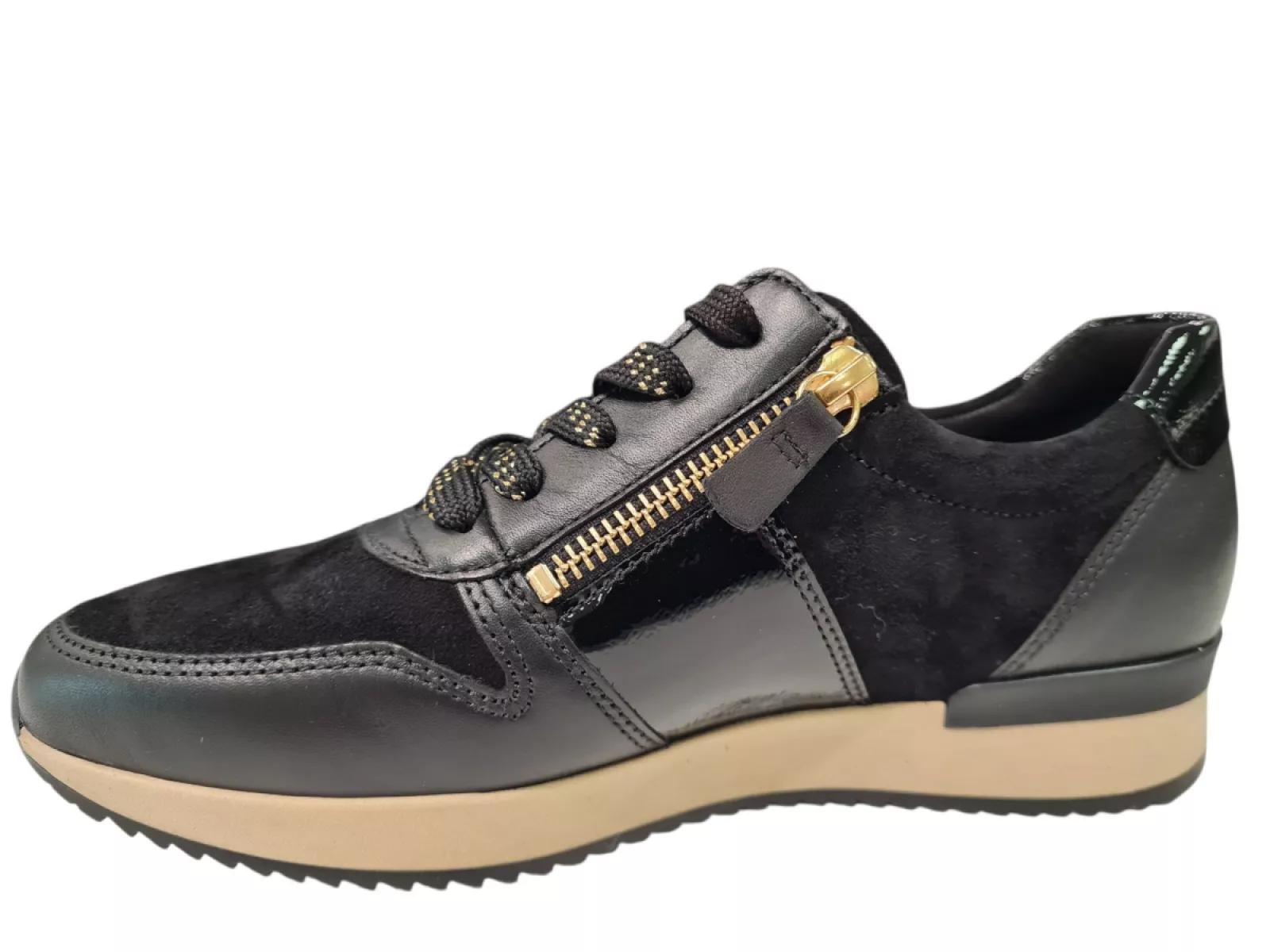 Ontdek de Gabor Dames Sneakers, perfect voor stijl en comfort. Deze sneakers zijn gemaakt van een combinatie van suede, leer en lak, en hebben een luxe leren en textiele voering. Het uitneembare leren voetbed zorgt voor extra comfort, terwijl de rubberen profielzool grip biedt. De veter- en ritssluiting maken het aan- en uittrekken eenvoudig. Verkrijgbaar in klassiek zwart. Perfect voor elke gelegenheid.