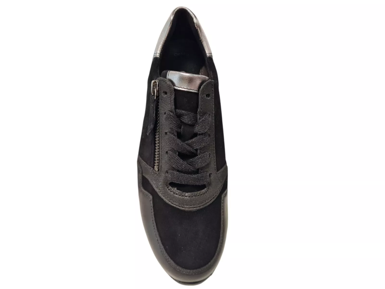 De Gabor dames sneakers zijn beschikbaar in een elegante zwarte kleur, aangevuld met zilveren accenten. Deze kleurcombinatie maakt het gemakkelijk om de sneakers te combineren met verschillende outfits, van casual tot chic.