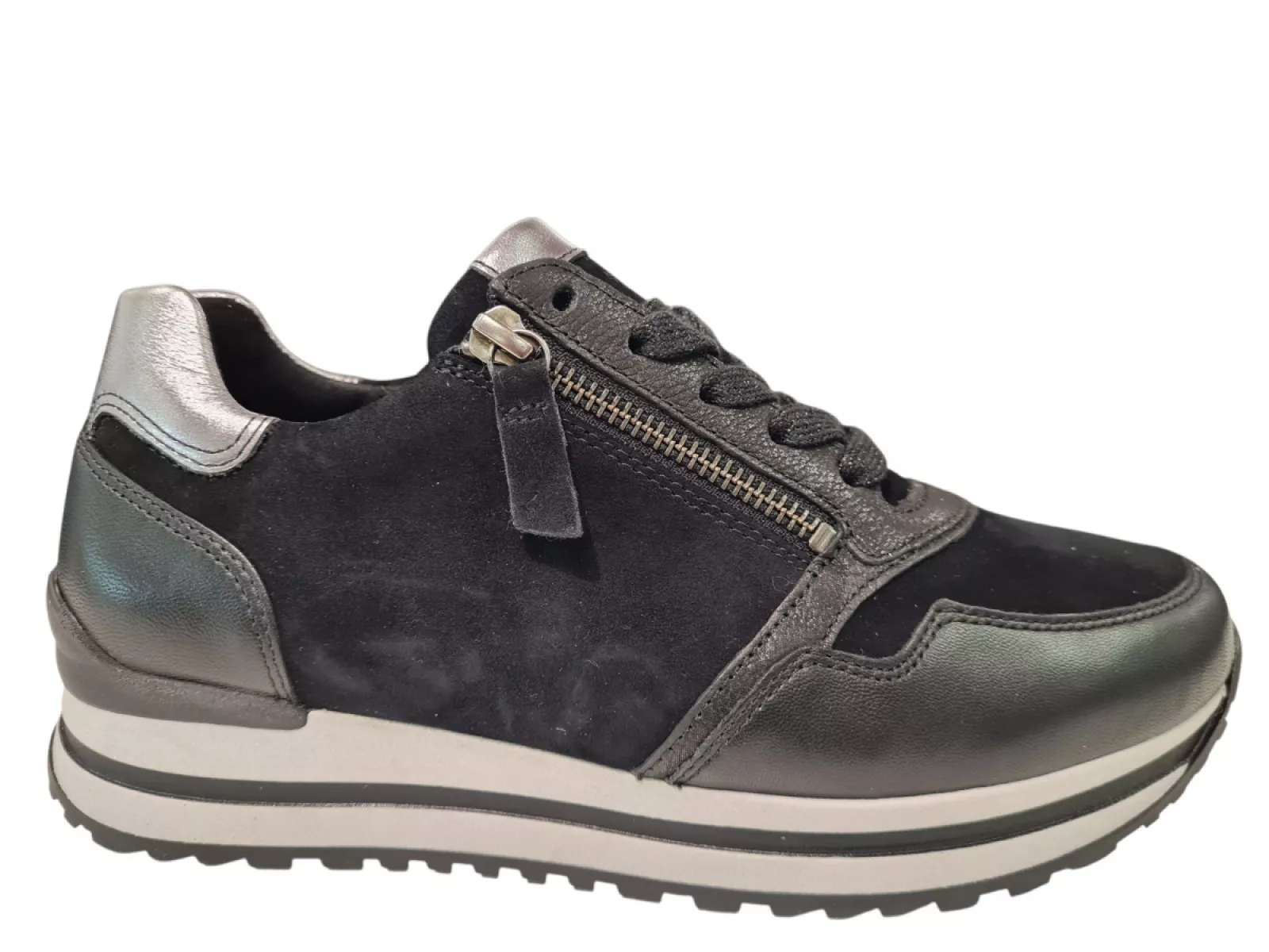Ontdek de Gabor Dames Sneakers, perfect voor stijl en comfort. Deze sneakers zijn vervaardigd uit hoogwaardig leer en suede, met een textiele voering voor extra ademend vermogen. Dankzij de breedtemaat H en het uitneembare voetbed bieden ze de ideale pasvorm. De combinatie van rits en vetersluiting zorgt voor een stevige fit. De rubberen profielzool biedt grip en duurzaamheid. Verkrijgbaar in zwart met zilveren accenten, zijn deze sneakers een veelzijdige aanvulling op je garderobe. Stap met vertrouwen de deur uit!