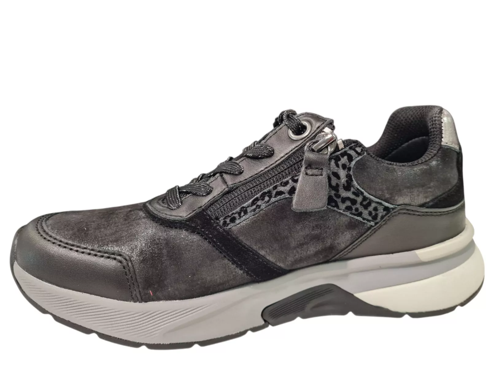 Ontdek de Gabor Dames Sneakers, waar comfort en stijl samenkomen. Deze sneakers zijn uitgerust met de innovatieve Rollingsoft technologie, wat zorgt voor een soepele afwikkeling bij elke stap. Gemaakt van luxe leer en suède, zijn ze textiel gevoerd voor optimaal draagcomfort. Het uitneembare voetbed biedt extra flexibiliteit. Dankzij de rits- en vetersluiting zijn ze eenvoudig aan en uit te trekken. De rubberen profielzool zorgt voor uitstekende grip. Beschikbaar in zwart met elegante zilveren accenten en een trendy panterprint. Perfect voor elke gelegenheid!