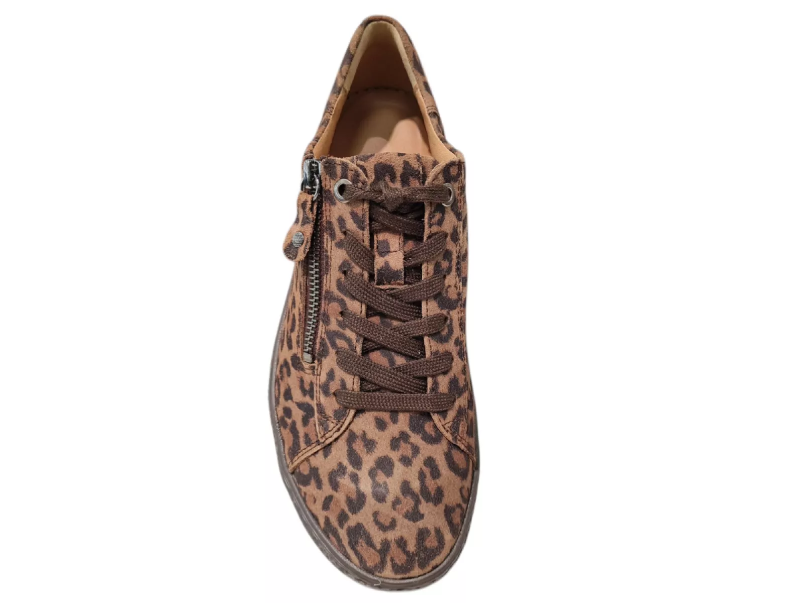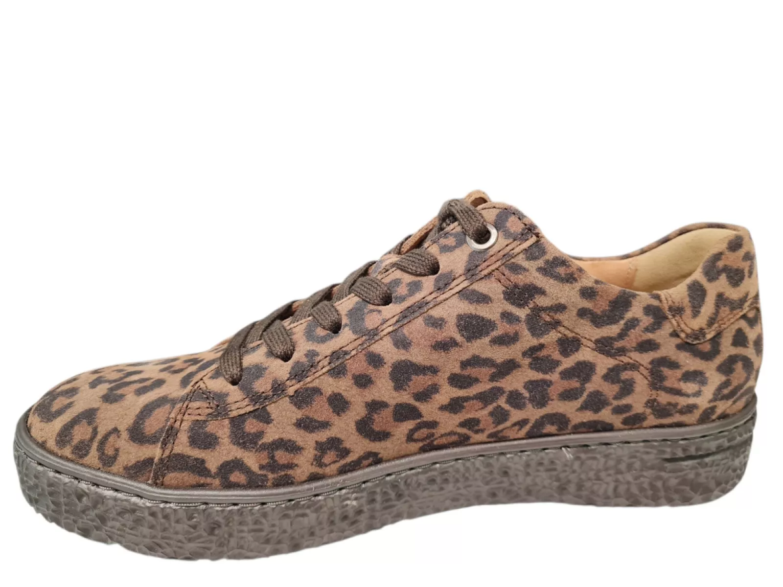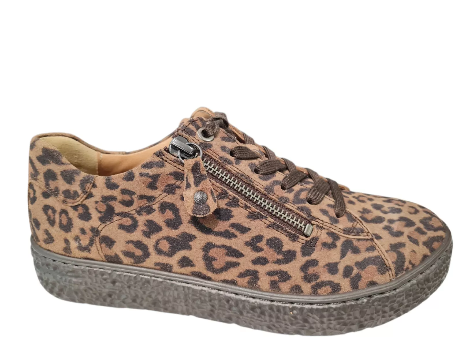 Stijlvolle sneakers van Hartjes, uitgevoerd in luxe suede met een modieuze panterprint in bruin. Deze sneakers zijn leer gevoerd voor optimaal comfort en hebben een breedtemaat H, ideaal voor bredere voeten. De rubberen profielzool biedt grip en stabiliteit, terwijl het uitneembare voetbed het mogelijk maakt om je eigen inlegzolen te gebruiken. Voor makkelijk aan- en uittrekken zijn de sneakers voorzien van een vetersluiting en een ritssluiting. Perfect voor een casual look met een trendy twist.