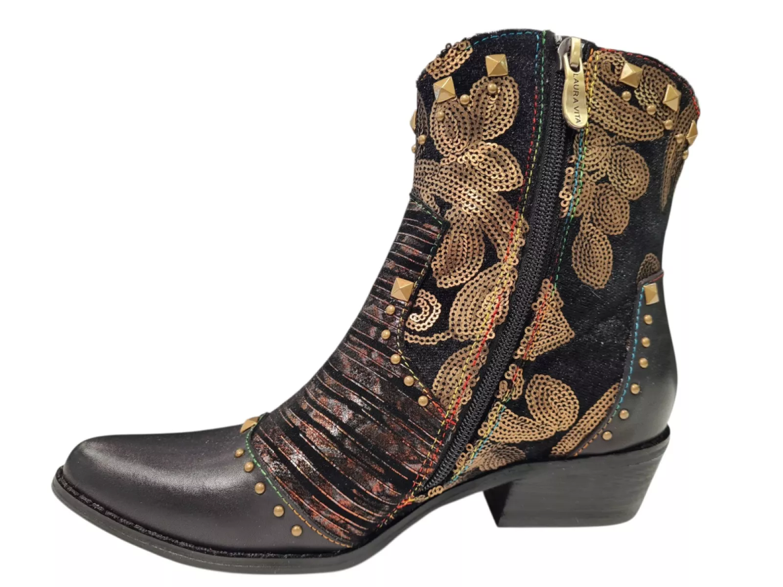 Deze cowboyboots zijn beschikbaar in een elegante zwarte kleur, die perfect te combineren is met verschillende outfits. De gouden accenten geven een unieke en glamoureuze uitstraling, waardoor de Laura Vita Dames Cowboyboots een echte eyecatcher zijn.