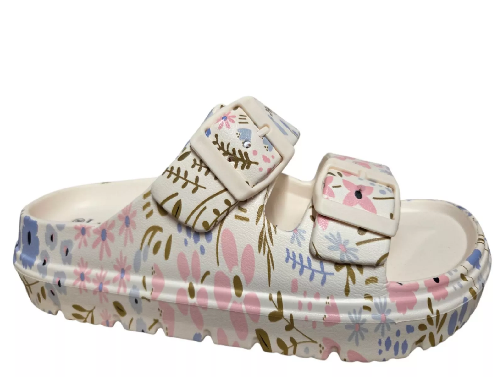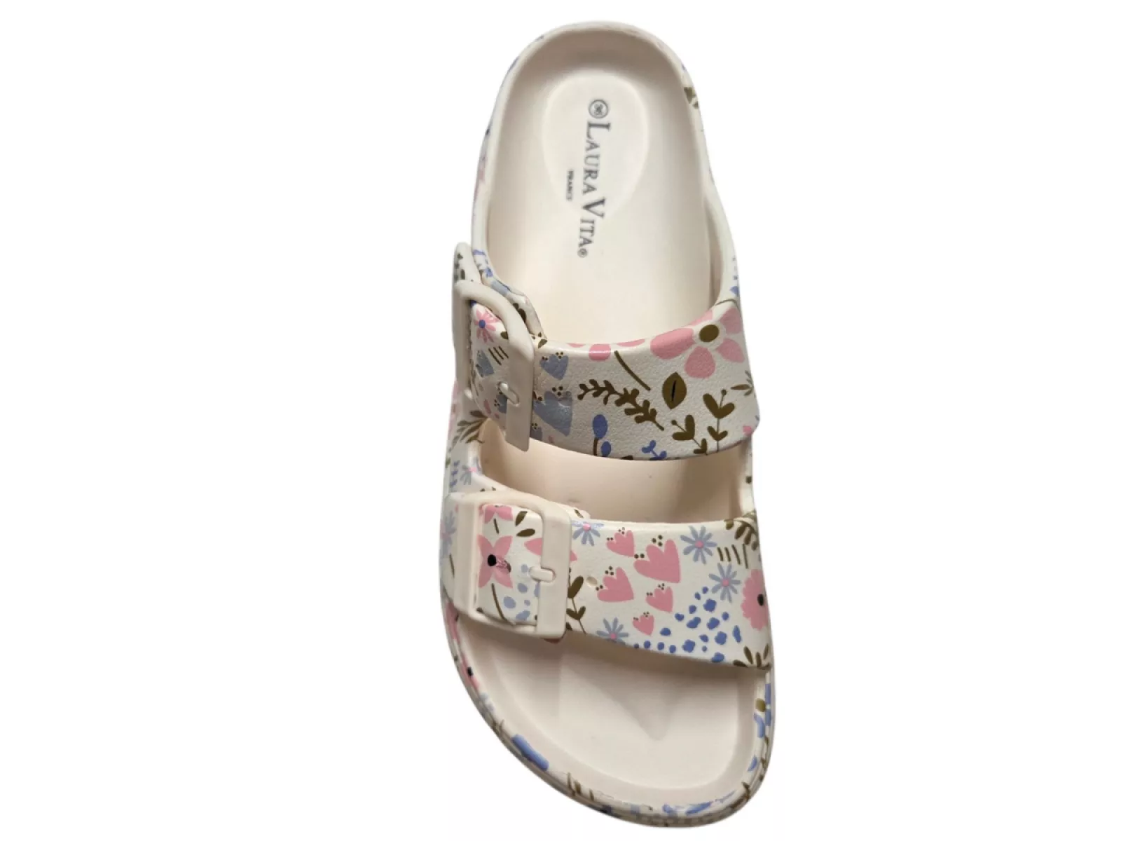 Stap stijlvol de lente en zomer in met de Nuon 01 slippers van Laura Vita. Deze beige gebloemde slippers combineren comfort en design dankzij het zachte rubberen voetbed en de stevige rubberen zool. De gespsluiting zorgt voor een perfecte pasvorm, terwijl het vrolijke bloemenpatroon jouw outfit een zomerse touch geeft. Ideaal voor een ontspannen dag in het voorjaar of zomer 2026.