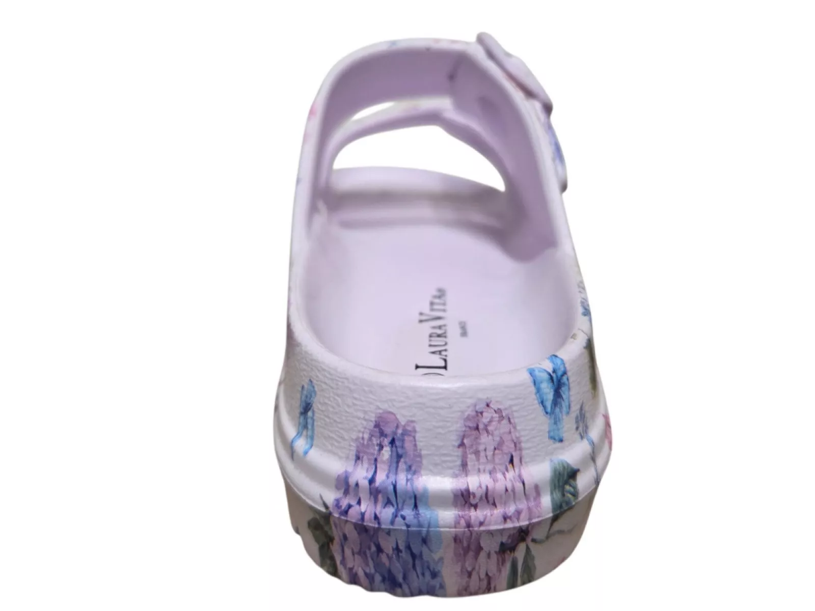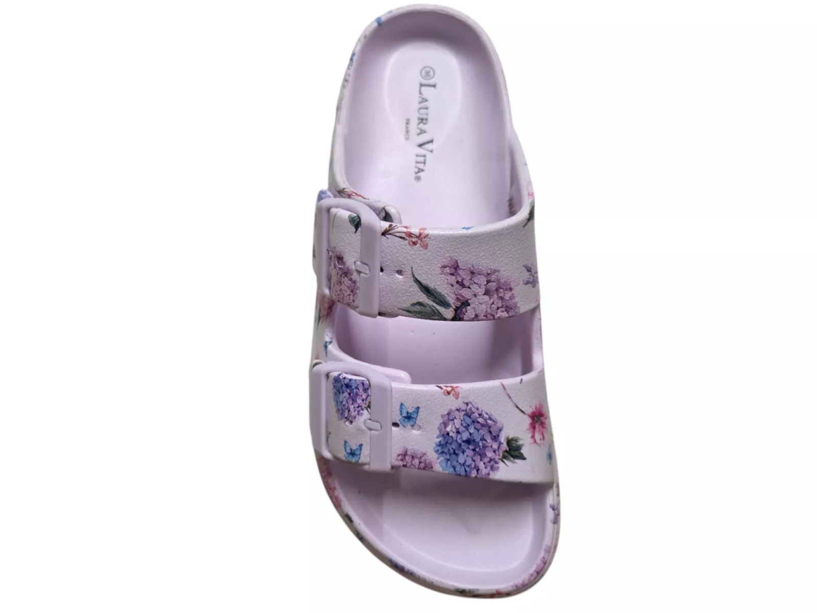 Breng kleur in je zomer met deze stijlvolle paars gebloemde slippers van Laura Vita. Het rubberen materiaal van buitenkant, voering en voetbed zorgt voor comfortabel draagplezier, terwijl de gespen een perfecte pasvorm garanderen. Met hun normale pasvorm en stevige rubberen zool zijn deze slippers ideaal voor zonnige dagen in het voorjaar en de zomer van 2026.