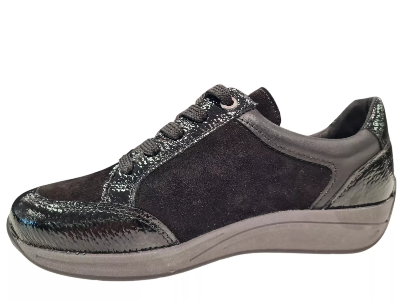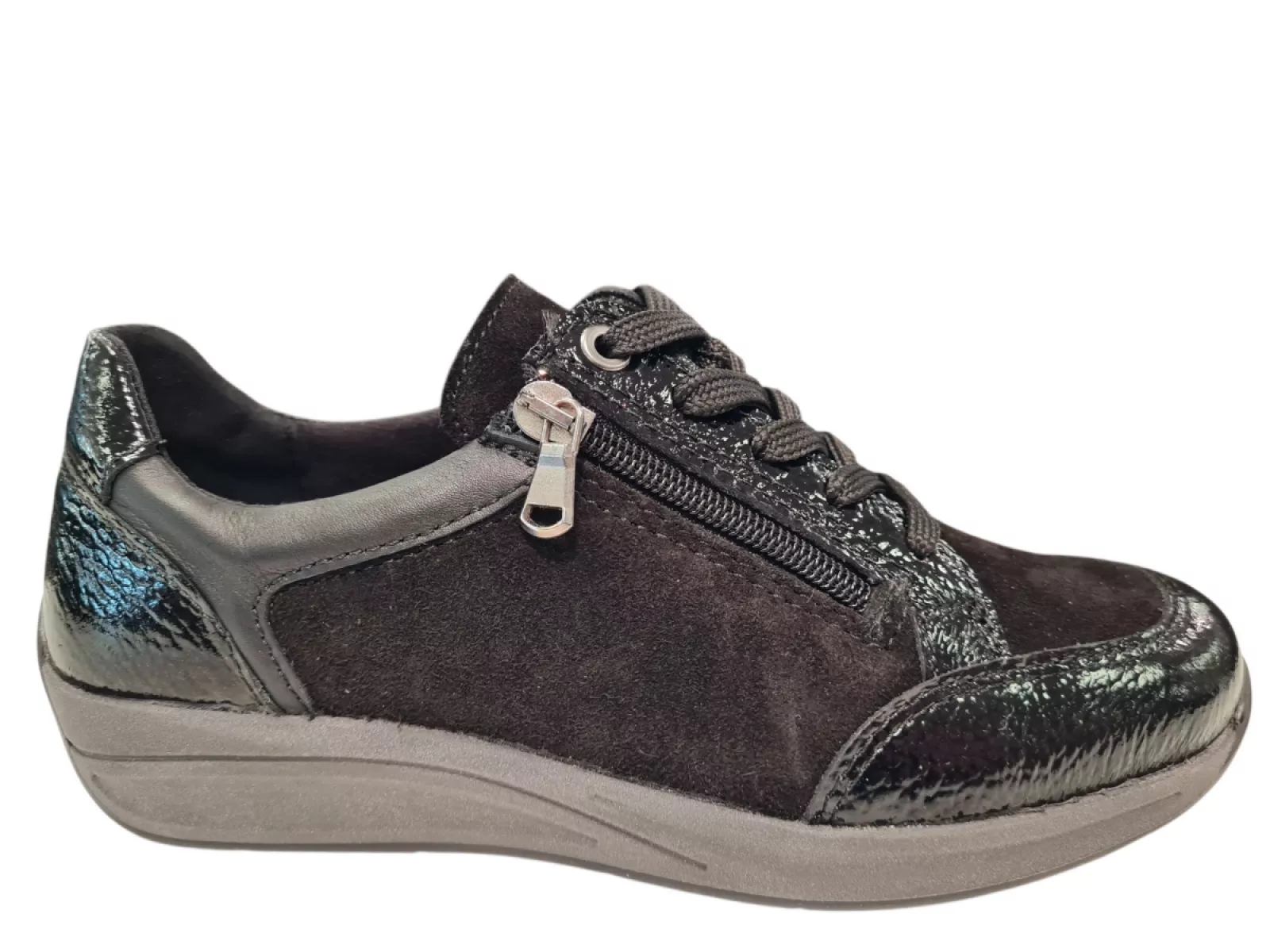Ontdek de Longo Dames Sneakers in zwart, een perfecte combinatie van stijl en comfort. Gemaakt van hoogwaardig suede en textiel, bieden deze sneakers een luxe uitstraling. Ze zijn volledig gevoerd met textiel voor optimaal draagcomfort en hebben een uitneembaar voetbed voor extra aanpasbaarheid. De rubber zool zorgt voor een stevige grip. Dankzij de veter- en ritssluiting trek je ze eenvoudig aan en uit. Ideaal voor elke gelegenheid!