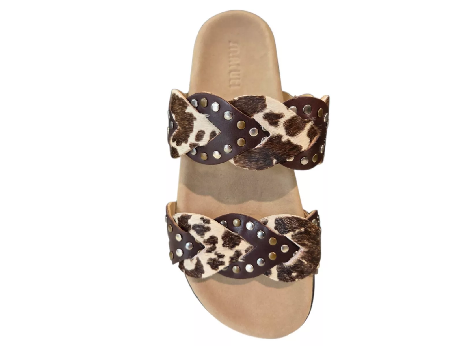 De Maruti Evie Hairon Cow D04 dames slippers zijn stijlvolle en comfortabele instap slippers voor het voorjaar en de zomer van 2026. Deze leren dames slippers met koeienvlekken print combineren mode en comfort perfect. De unieke donkerbruine hairon cow look geeft elke outfit een trendy en luxe uitstraling.