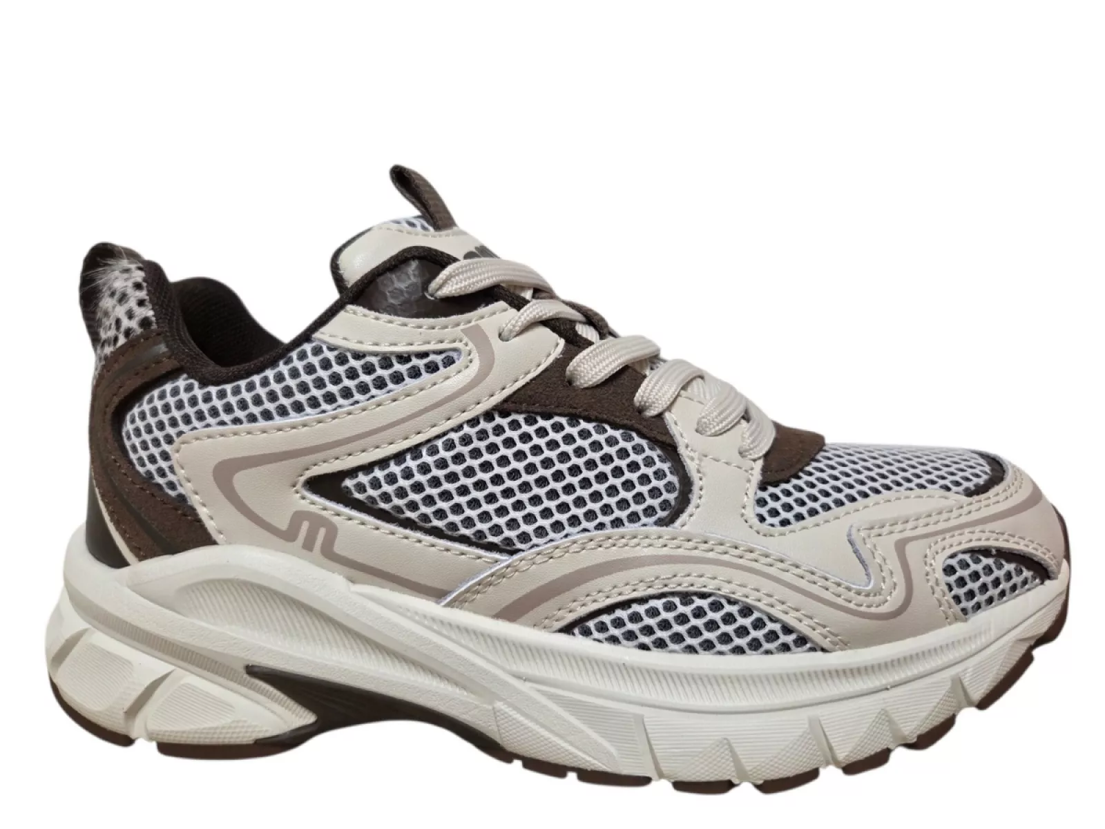 Stijlvol de lente en zomer in met de Maruti Novi Leather V78 dames sneakers. Uitgevoerd in een elegante mix van offwhite en bruin leer en textiel, met een comfortabele textielvoering en een uitneembaar voetbed. De rubberen profielzool biedt grip en flexibiliteit, terwijl de vetersluiting zorgt voor een perfecte pasvorm. Ideaal voor dagelijks gebruik, met een normale pasvorm die moeiteloos bij elke outfit past.
