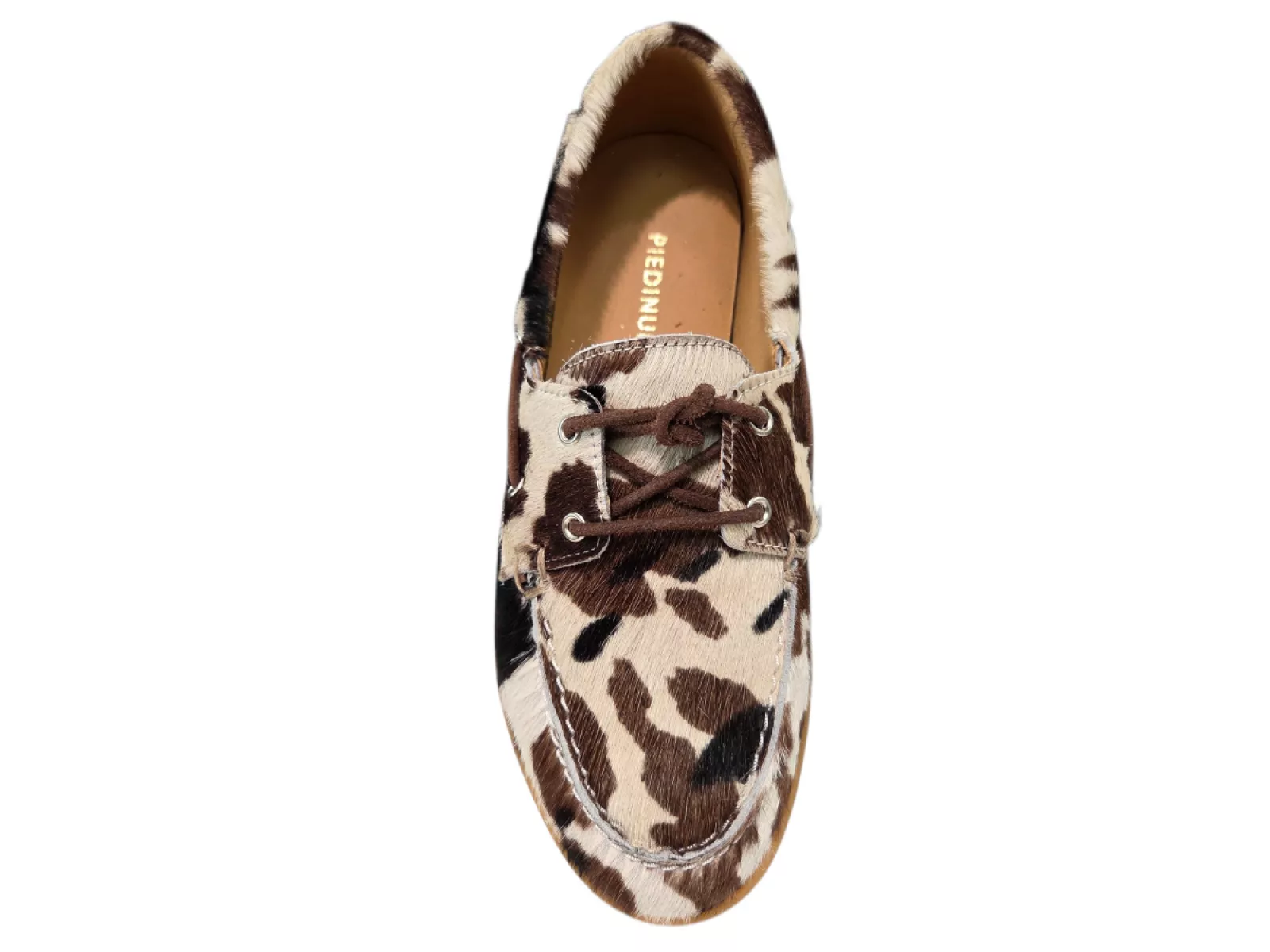 Ontdek de Piedi Nudi Porta 05.08 Cow: de perfecte zomerse dames veterschoenen die stijl, comfort en kwaliteit combineren. Deze suède schoenen met koeienprint geven elke outfit een unieke twist. Dankzij het uitneembare leren voetbed en de rubberen zool loop je de hele dag comfortabel, terwijl de vetersluiting zorgt voor een perfecte pasvorm. Ideaal voor dames die zoeken naar comfortabele, modieuze schoenen met een opvallend design.