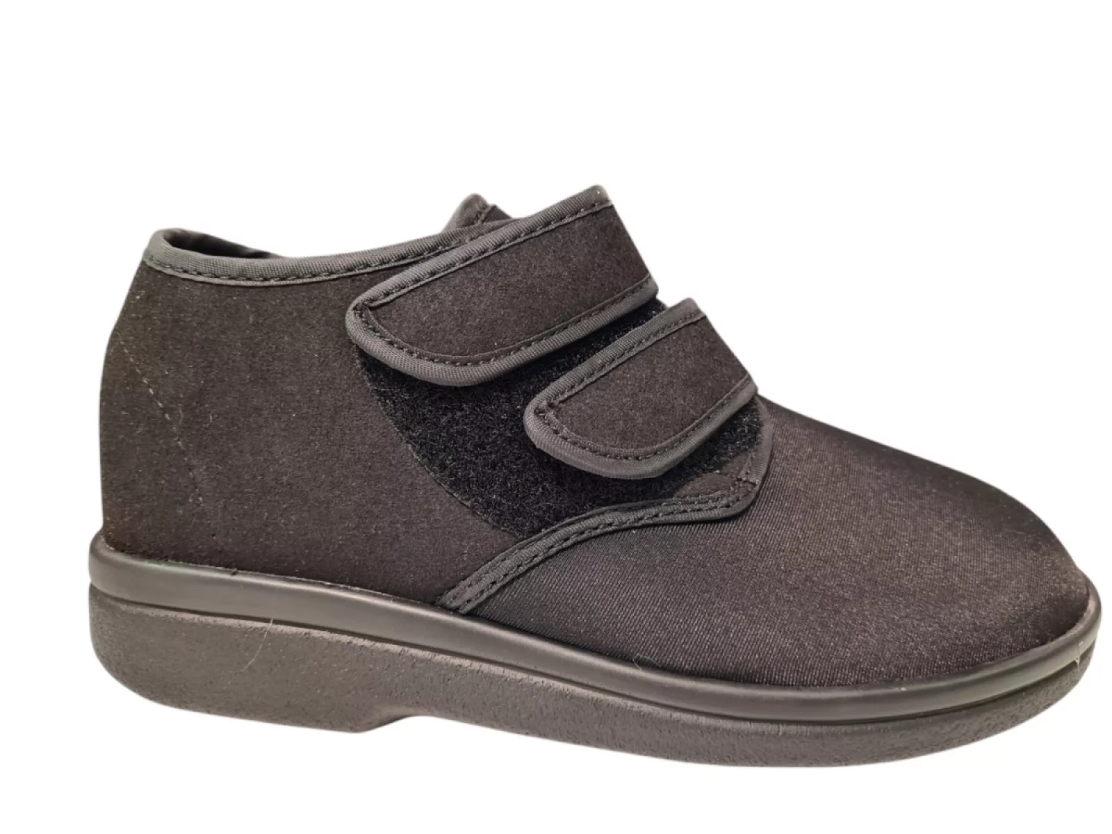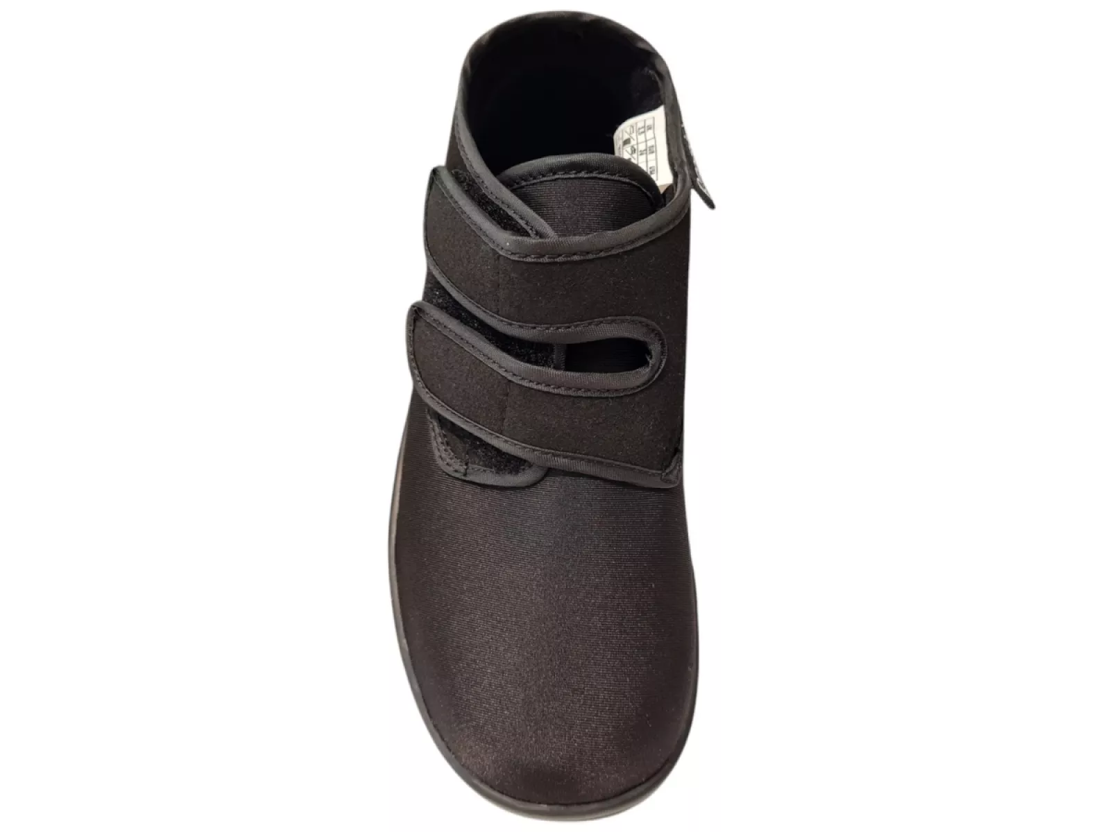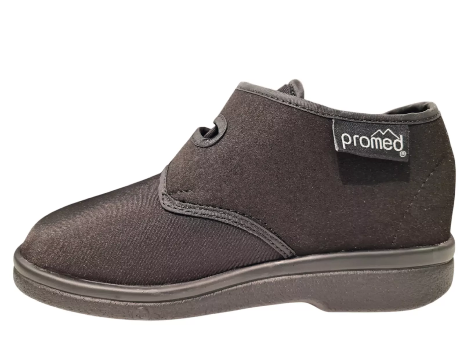 Deze comfortabele promed verbandpantoffels zijn speciaal ontworpen voor gezwachtelde benen en voeten. Met een textiel bekleding, stretchblad op de bovenzijde en een uitneembaar voetbed bieden ze optimale ondersteuning. De rubberen profielzool zorgt voor grip en stabiliteit. De dubbele klittenbandsluiting maakt het aan- en uittrekken eenvoudig. Perfect voor diabetici. Verkrijgbaar in zwart.