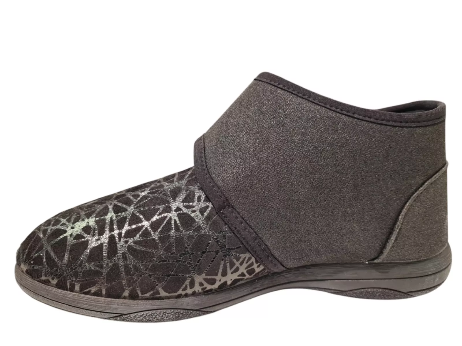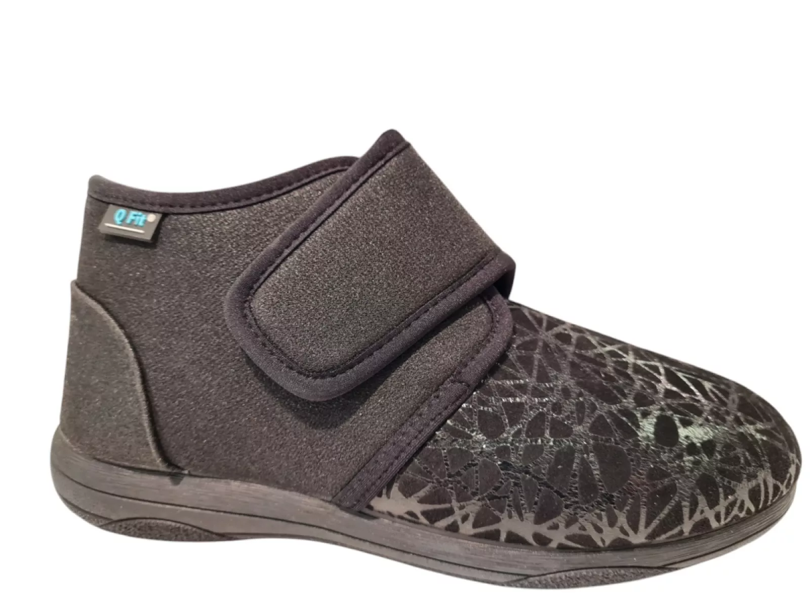 Ervaar comfort en ondersteuning met de Q Fit Unisex Verbandpantoffels. Deze pantoffels zijn speciaal ontworpen voor gezwachtelde benen en voeten. Ze hebben een stretchblad op de bovenzijde, een textiel voering en een rubberen profielzool voor optimale grip. Het uitneembare voetbed en de klittenbandsluiting zorgen voor een perfecte pasvorm. Het hoog model biedt extra bescherming. Verkrijgbaar in zwart. Ideaal voor diabetici.