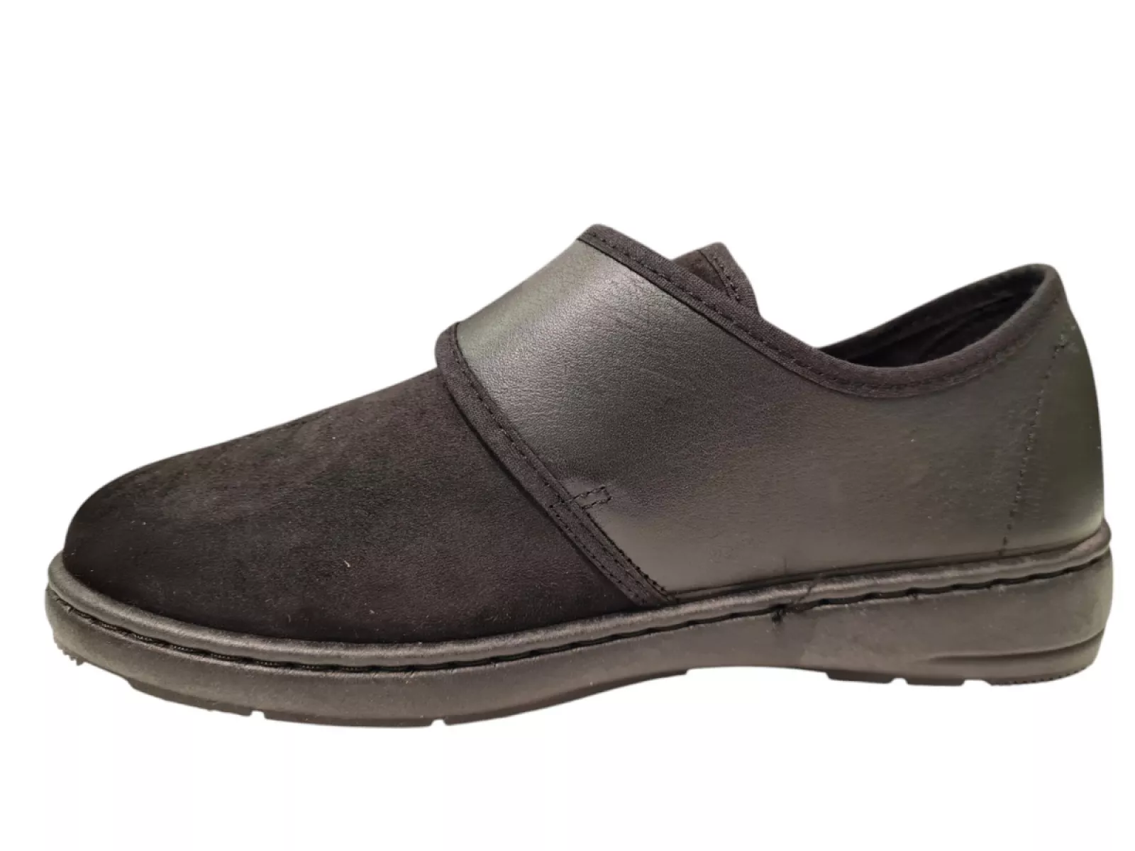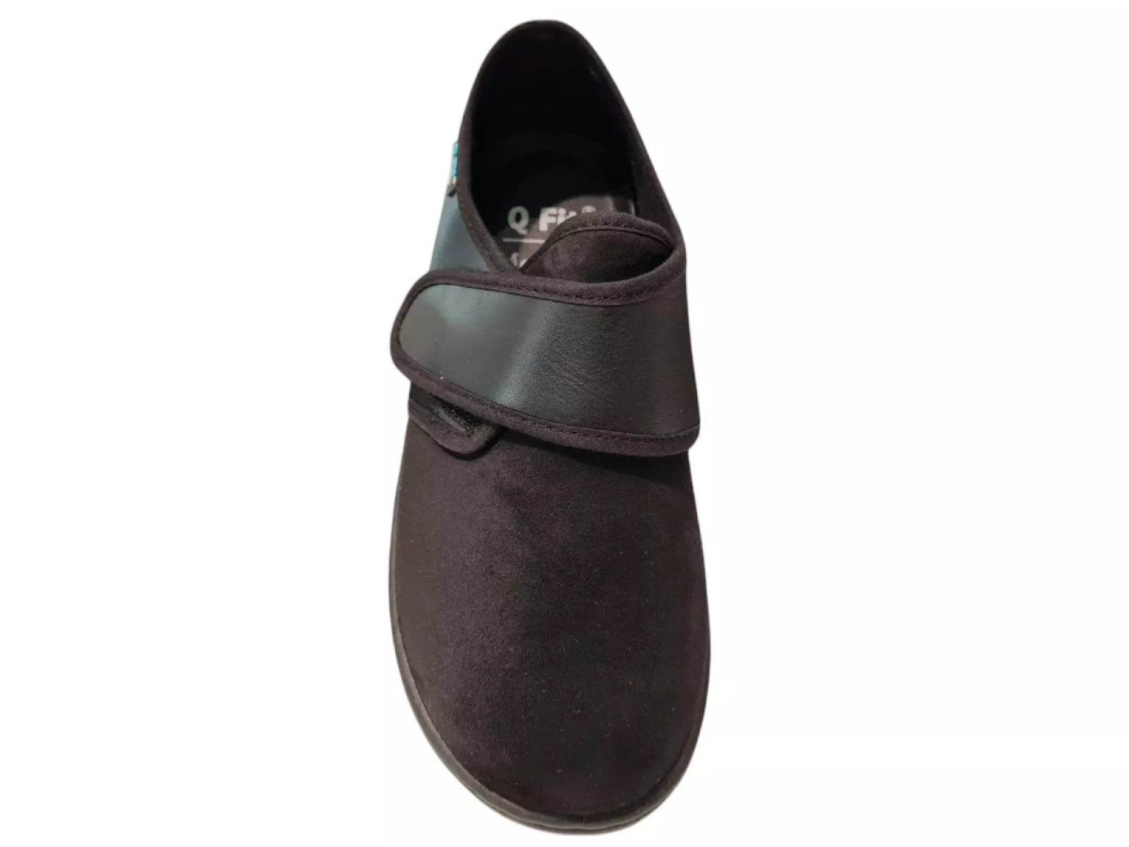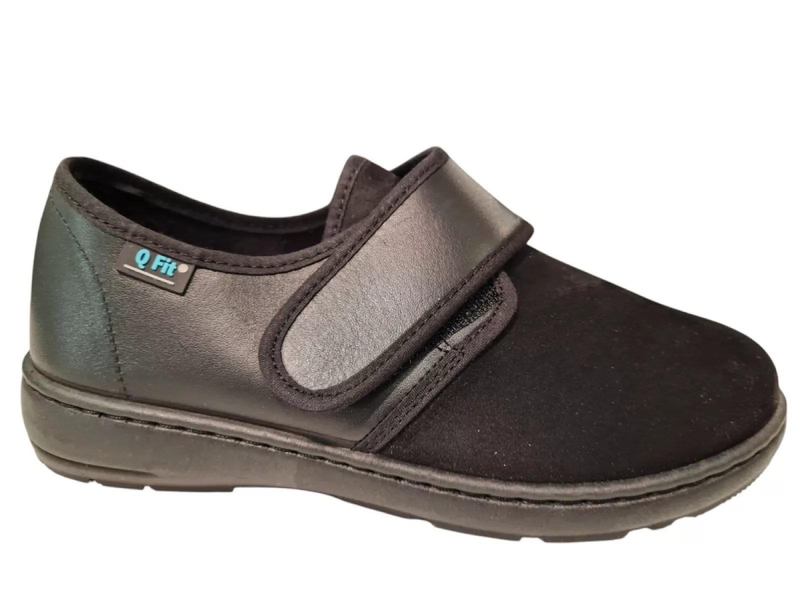 Deze Q Fit verbandpantoffels zijn ideaal voor gezwachtelde benen en voeten. Gemaakt van textiel en leer, bieden ze optimale ondersteuning en comfort. De rubberen profielzool zorgt voor grip, terwijl het uitneembare voetbed aanpasbaarheid biedt. Met een handige klittenbandsluiting zijn ze eenvoudig aan en uit te trekken. Perfect voor diabetici. Verkrijgbaar in zwart.