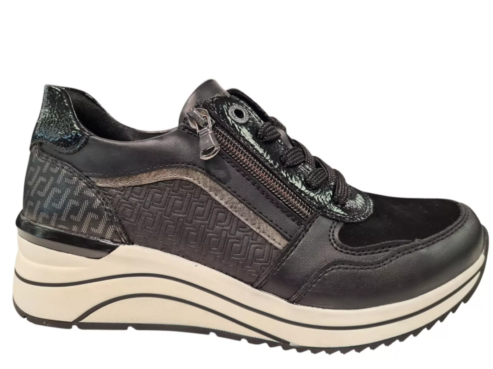 Ontdek de Remonte Dames Sneakers: stijlvol en comfortabel. Gemaakt van leer en suede, met een textielen voering voor extra comfort. Het uitneembare voetbed en de rubberen profielzool bieden optimale ondersteuning. De combinatie van rits- en vetersluiting zorgt voor een perfecte pasvorm. Verkrijgbaar in zwart met speelse gouden accenten. Ideaal voor elke gelegenheid.