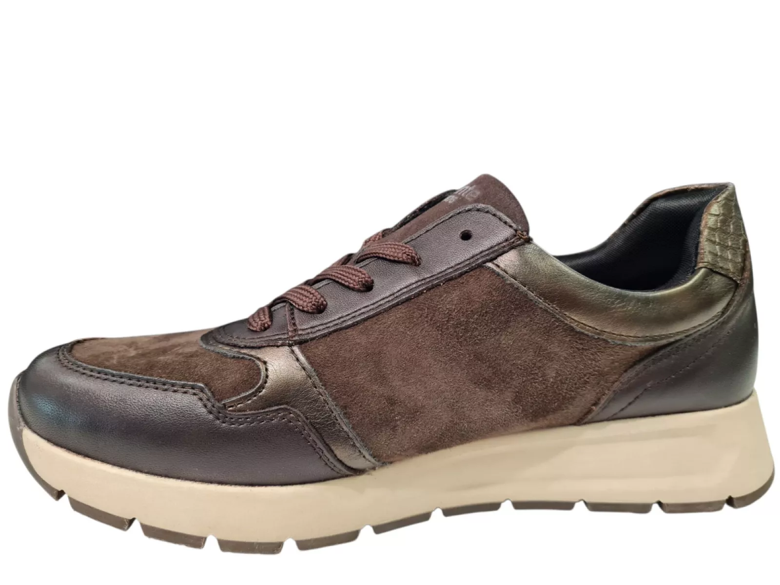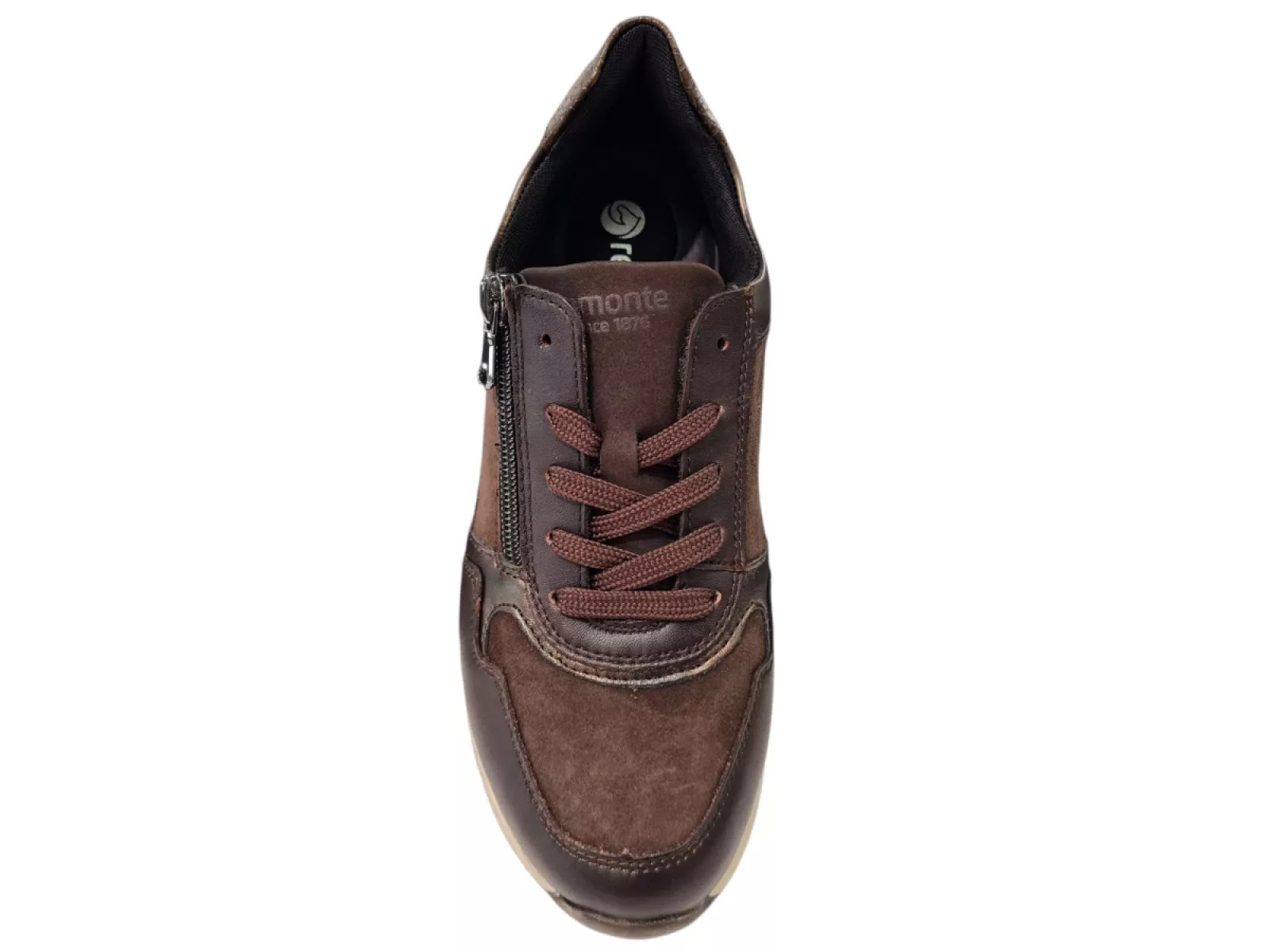 Ontdek de Remonte Dames Sneakers, stijlvol en comfortabel. Gemaakt van suède en leer met een zachte textielvoering. Het uitneembare voetbed biedt extra comfort, terwijl de rubberen profielzool zorgt voor goede grip. De sneakers zijn voorzien van een vetersluiting en een rits voor eenvoudig aan- en uittrekken. Verkrijgbaar in bruin met bronzen accenten, perfect voor elke gelegenheid.