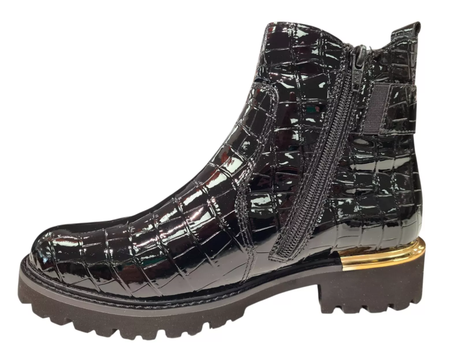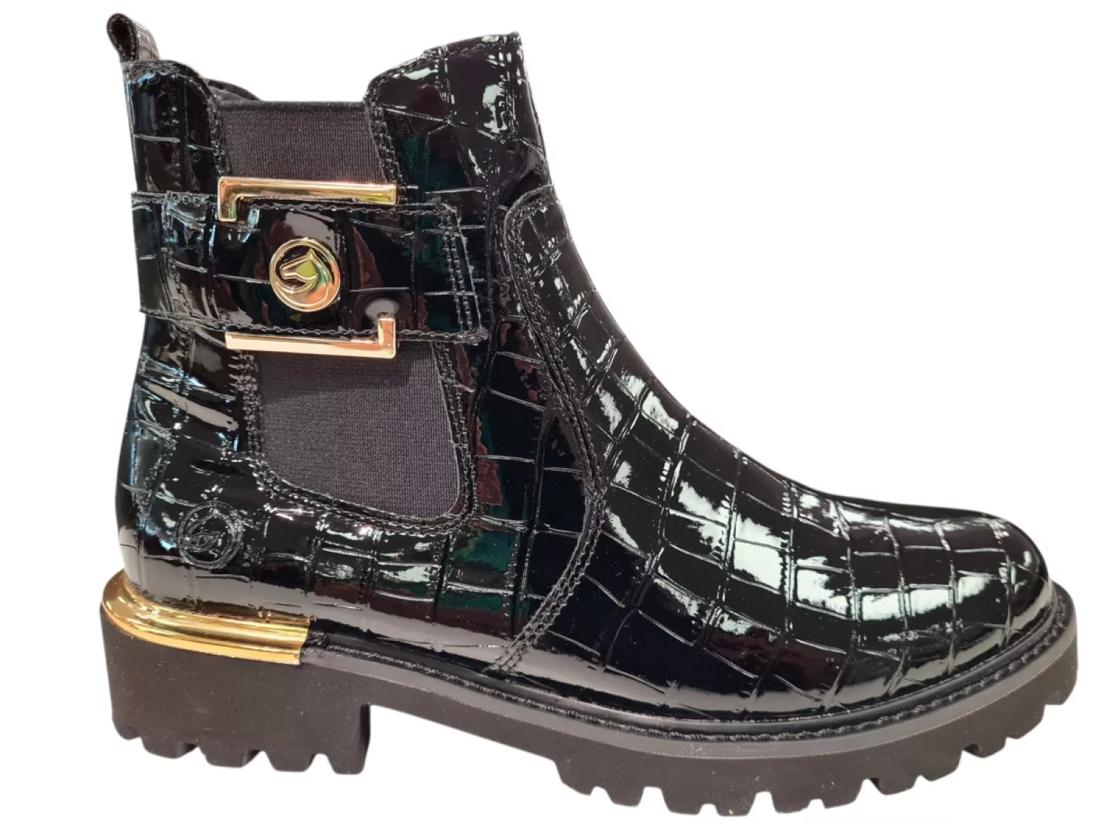 Ontdek de Remonte Dames laarzen, stijlvol en functioneel. Gemaakt van lak gekleed materiaal, bieden deze laarzen niet alleen een elegante uitstraling, maar zijn ze ook fleece gevoerd voor extra comfort. Het uitneembare voetbed zorgt voor een optimale pasvorm, terwijl de rubberen zool voor goede grip en duurzaamheid zorgt. De handige ritssluiting maakt het aan- en uittrekken eenvoudig. Verkrijgbaar in zwart met gouden accenten, perfect voor elke gelegenheid. Maak je outfit compleet met deze must-have laarzen.