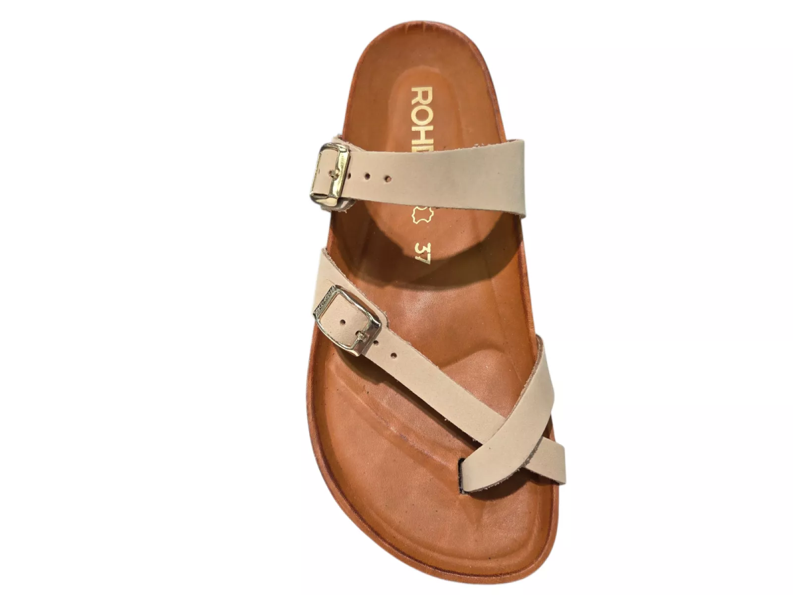 Ontdek de Rohde 5643 16 dames teenslippers. Deze stijlvolle slippers zijn gemaakt van nubuck en hebben een luxe leren voering. Het voorgevormde leren voetbed biedt optimaal comfort, terwijl de rubberen zool zorgt voor een goede grip. Dankzij de verstelbare gespen zijn ze eenvoudig aan te passen aan jouw voet. Verkrijgbaar in een elegante beige kleur. Perfect voor een casual dag of een ontspannen vakantie. https://www.schoenhuisbrink.nl/ en https://www.pantoffelspecialist.nl/