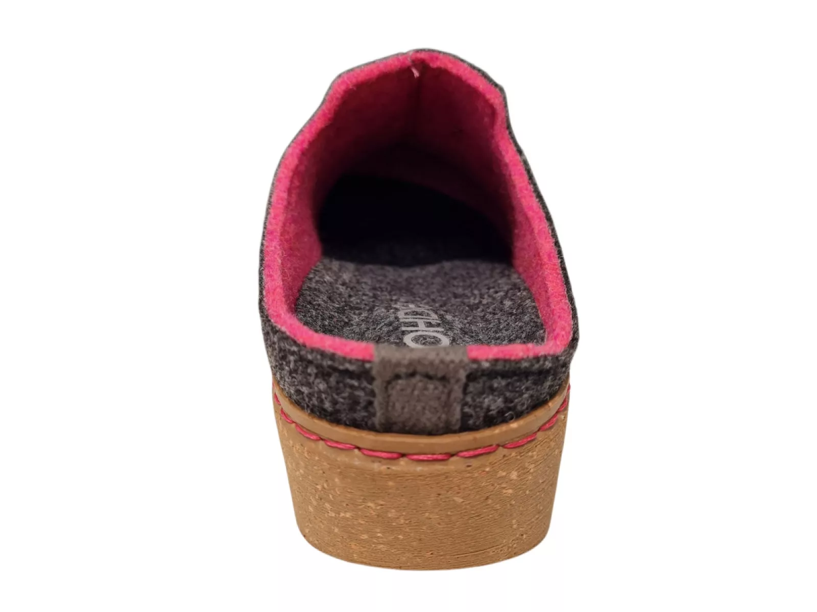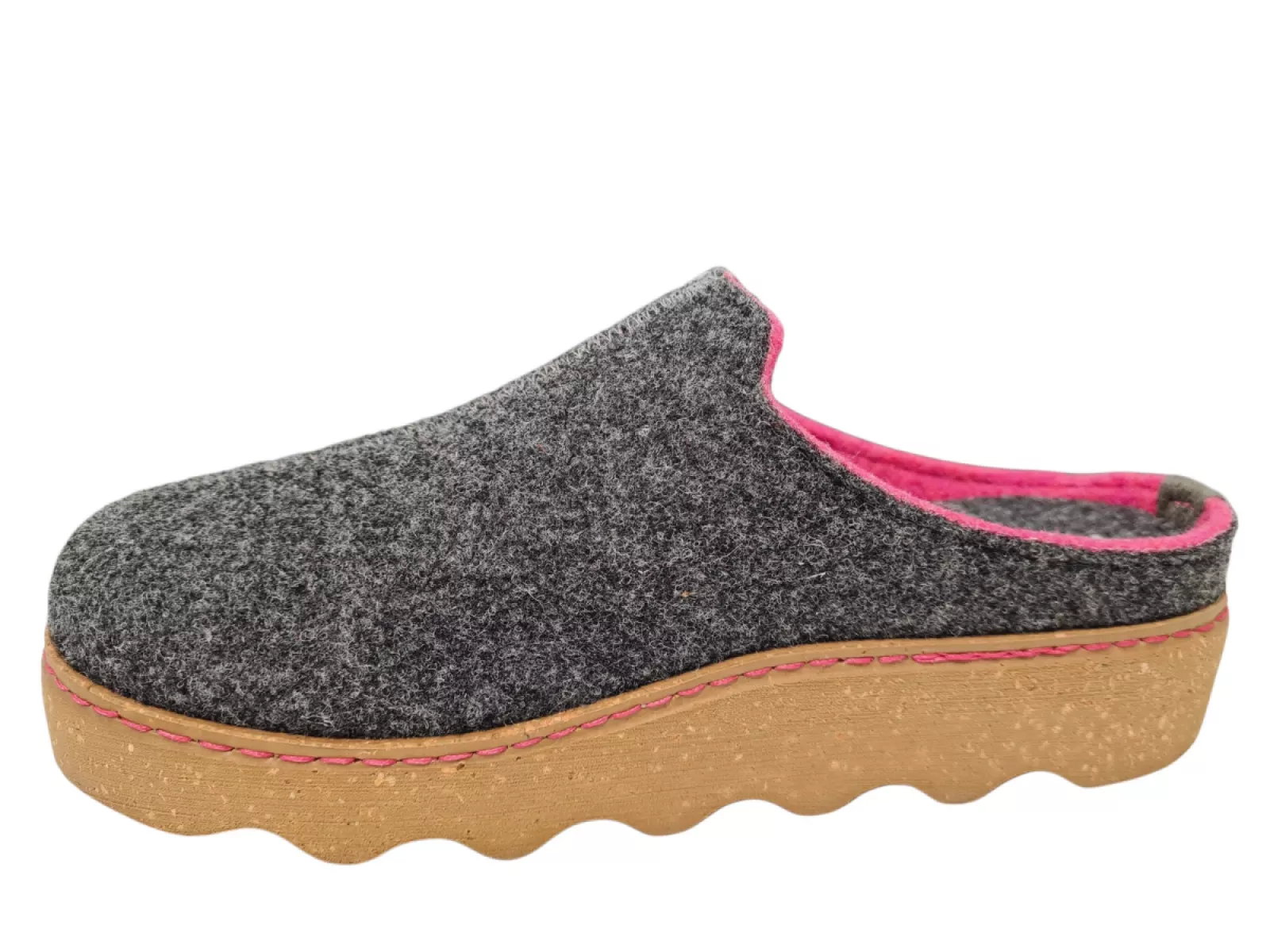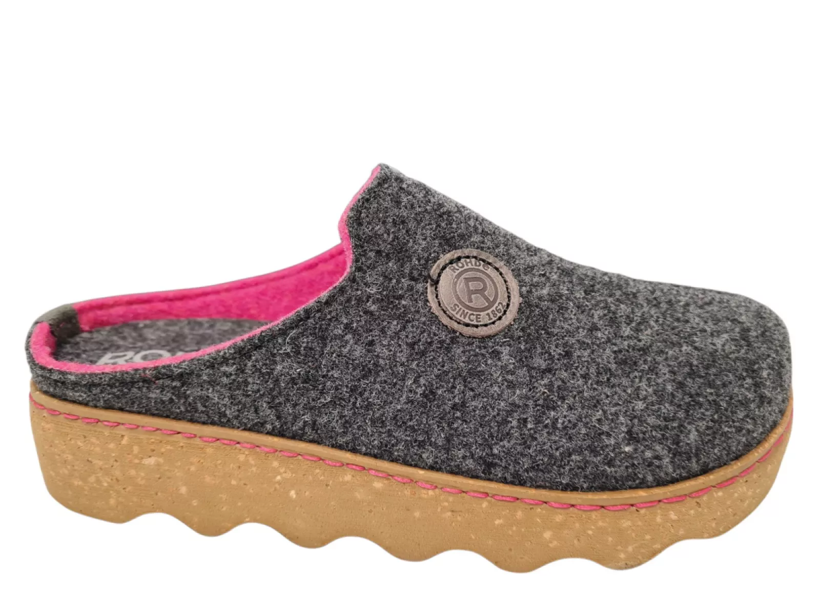 Ontdek de Rohde dames pantoffels, perfect voor comfort en stijl. Gemaakt van vilt, zowel aan de buitenkant als van binnen, bieden ze een zachte en ademende pasvorm. De open hiel zorgt voor een gemakkelijke instap, terwijl het uitneembare voetbed aanpasbaar is aan jouw behoeften. De honingkleurige rubberen profielzool geeft grip en duurzaamheid. Verkrijgbaar in donkergrijs met een roze binnenzijde. Nu te koop bij de pantoffelspecialist.nl.